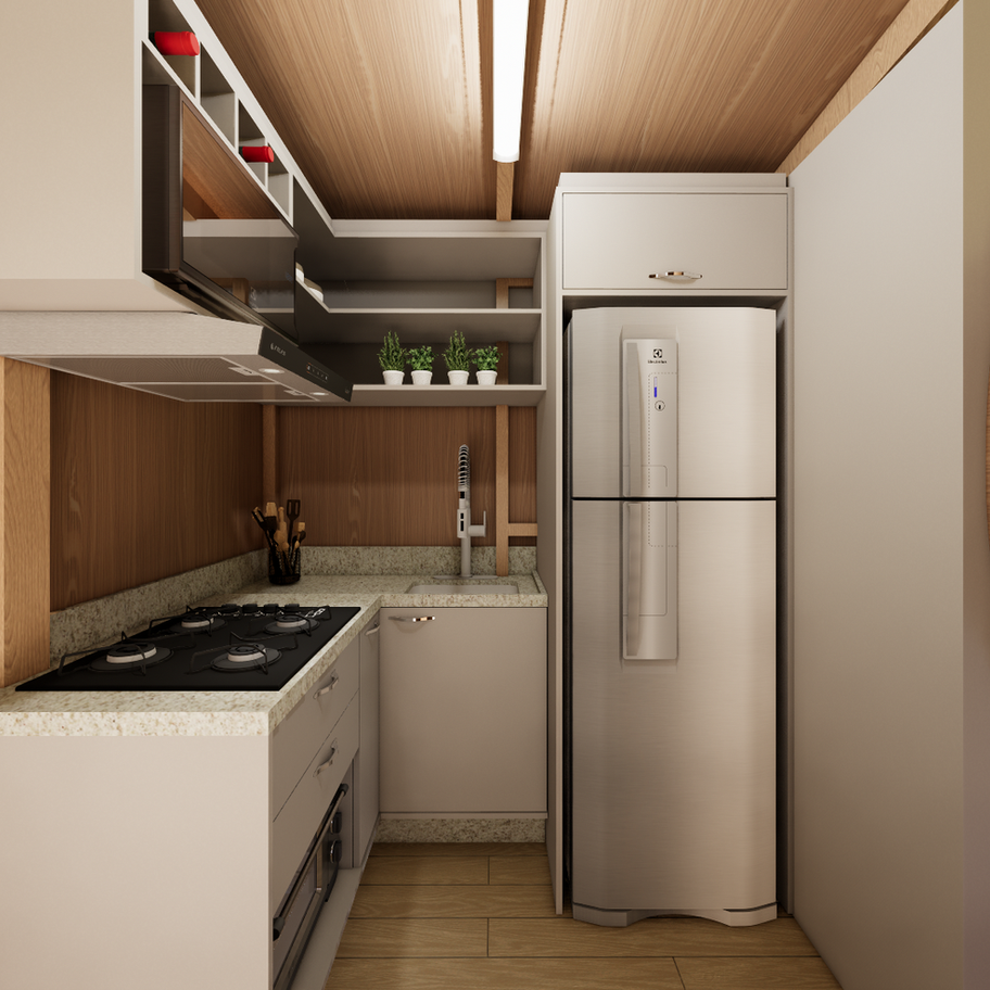 prática e confortável. Com 15m², integra quarto, cozinha e um banheiro interno
