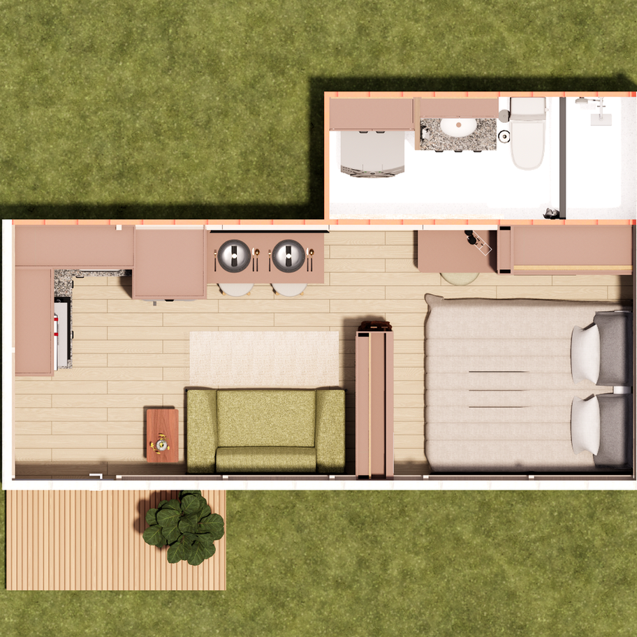 interno com melhor aproveitamento. O banheiro fica em um módulo lateral, liberando